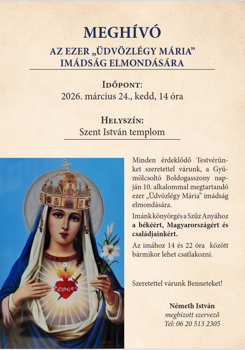 1000 üdvözlégy imádkozása Gyümölcsoltó Boldogasszony vigíliáján NAndrás 2026-03-03 1000 üdvözlégy imádkozása Gyümölcsoltó Boldogasszony vigíliáján2026-03-11T08:06:12+01:00 Felnőtt No Comment